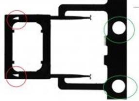 圖6,用遠(yuǎn)心鏡頭拍攝,由于遠(yuǎn)心鏡頭具有平行光的遠(yuǎn)心特性,不存在視覺(jué)誤差,所以在拍攝塑膠模具的透氣孔時(shí)(紅圈圈定),內(nèi)壁邊緣清晰,數(shù)據(jù)準(zhǔn)確。拍攝圓孔(綠色)時(shí),孔邊緣清晰,易于檢測(cè)到毛刺,以及檢測(cè)孔徑大小等。